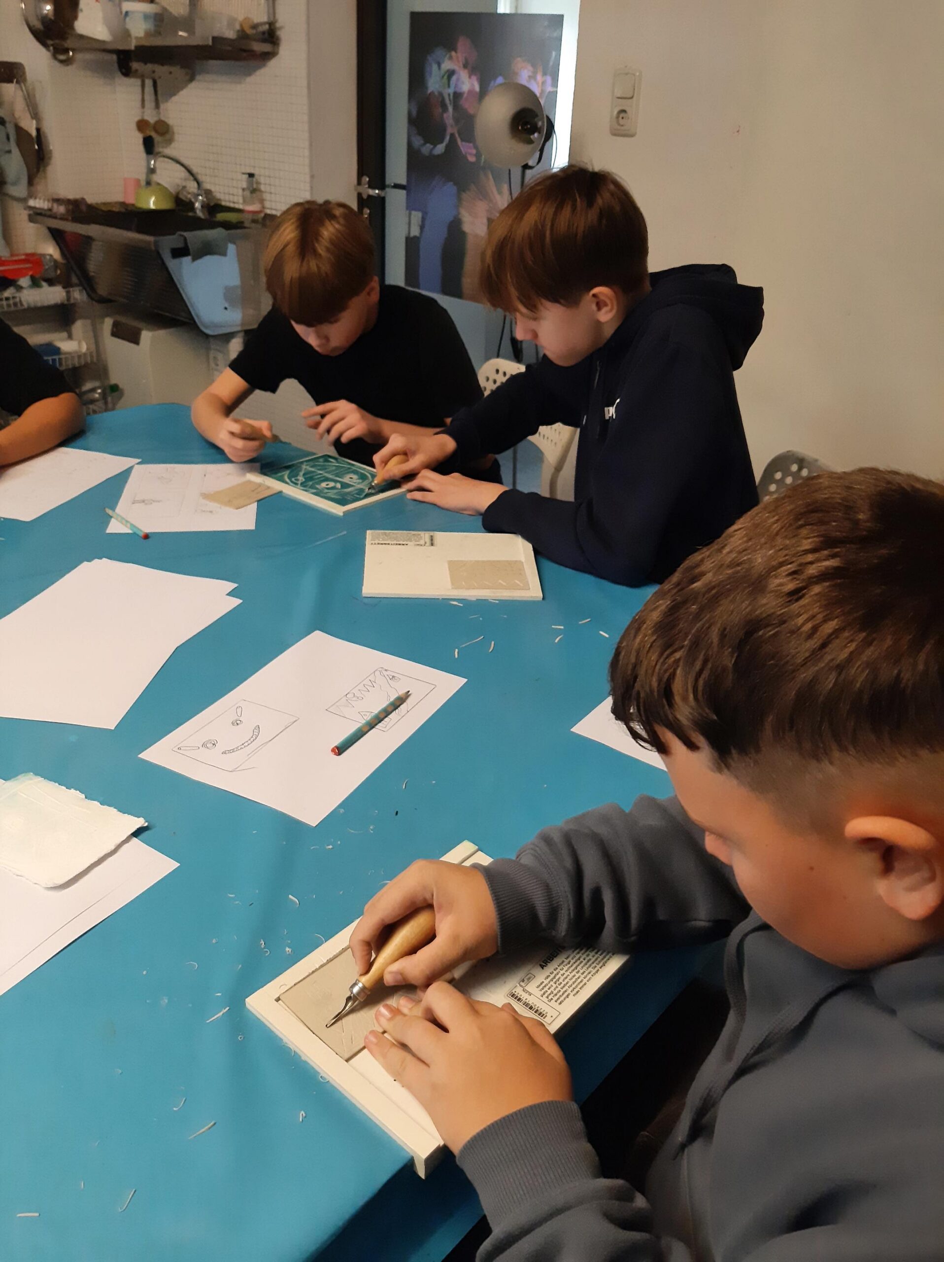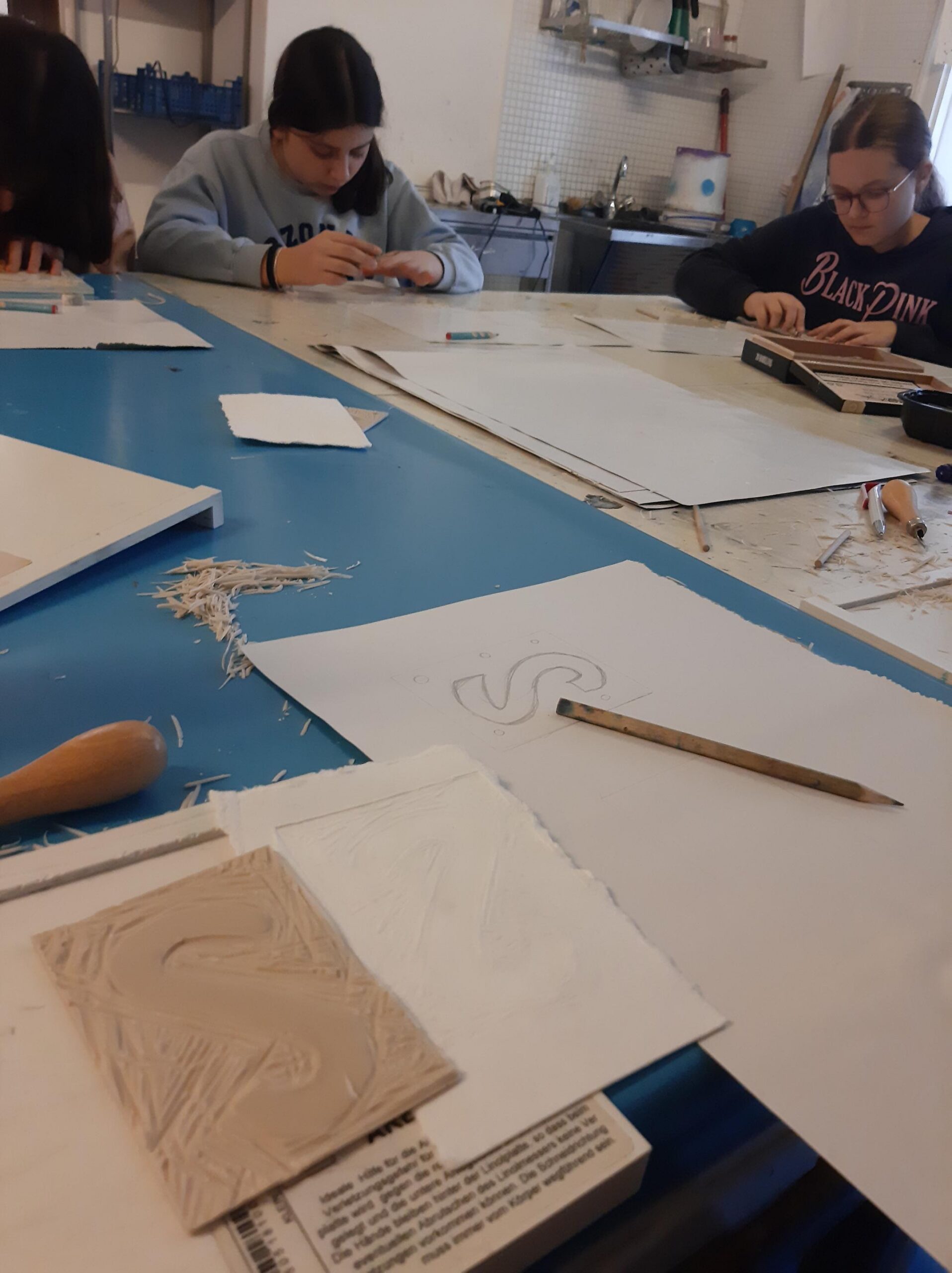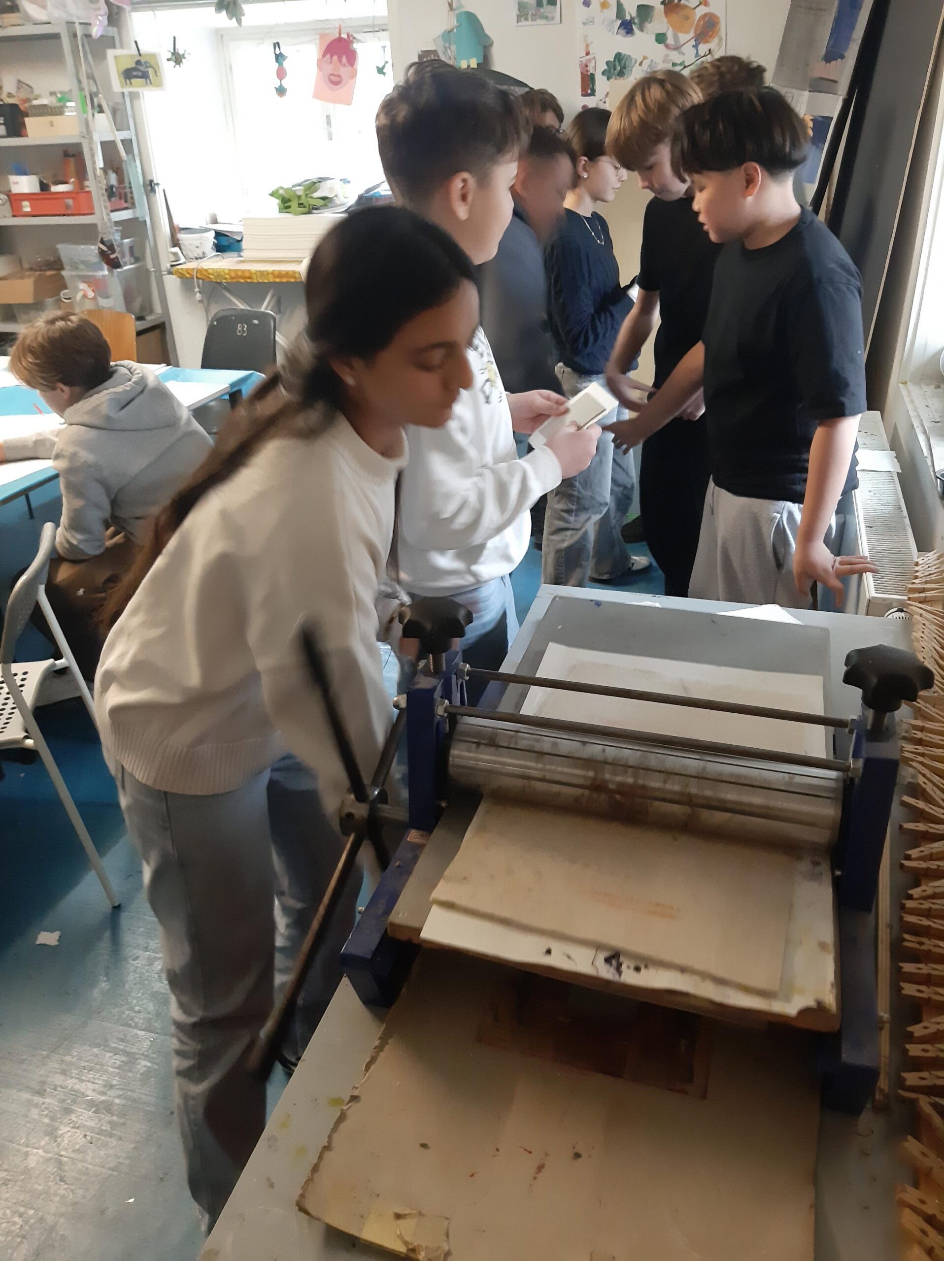 Kurz vor Weihnachten besuchte die Klasse 2b im Rahmen des Werkunterrichts einen Workshop bei den ARTgenossen im Künstlerhaus. Dabei fertigte jedes Kind einen eigenen Linolschnitt an. Anschließend wurden die Strukturen mit Hilfe einer Druckerpresse auf feuchtes, dickes Papier gepresst. Eine spannende Technik!